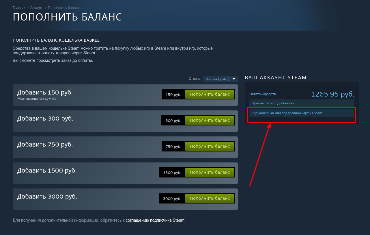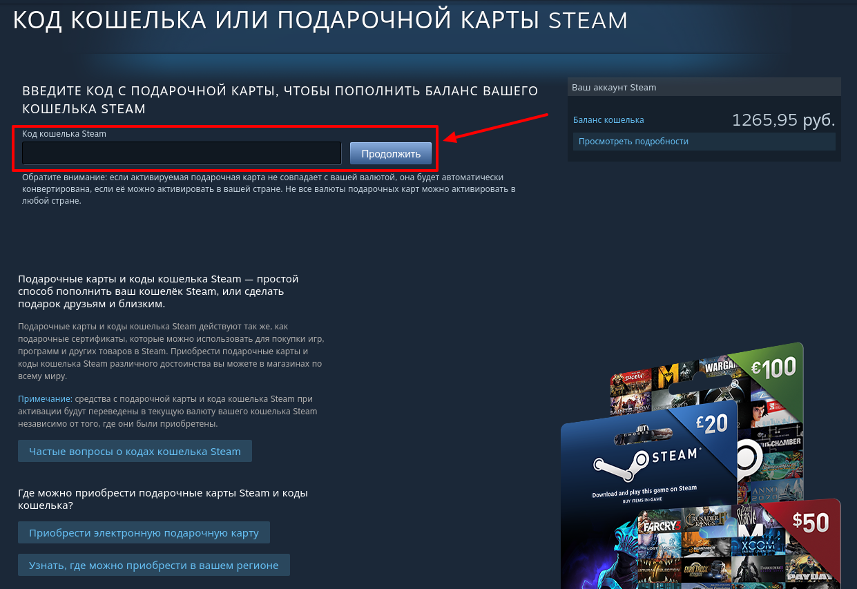 На следующей странице с правой стороны в отдельном блоке ты увидишь ссылку с названием "Код кошелька или подарочной карты Steam":