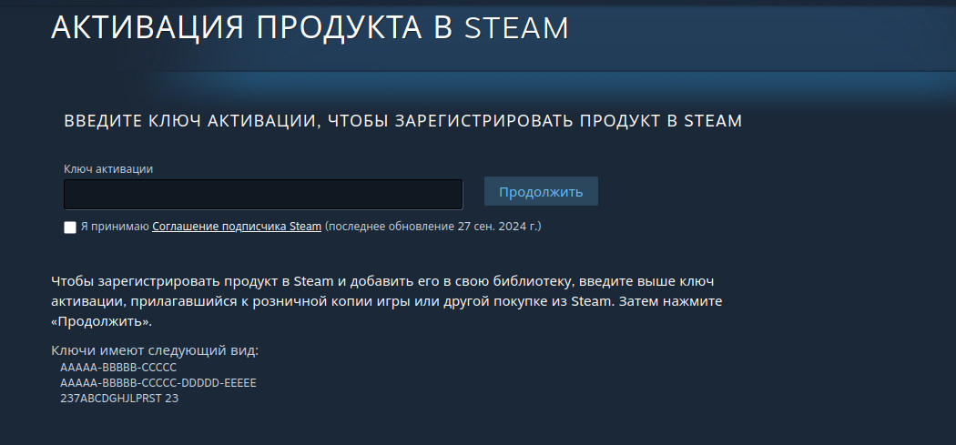 - Открой страницу активации продукта - https://store.steampowered.com/account/registerkey