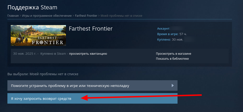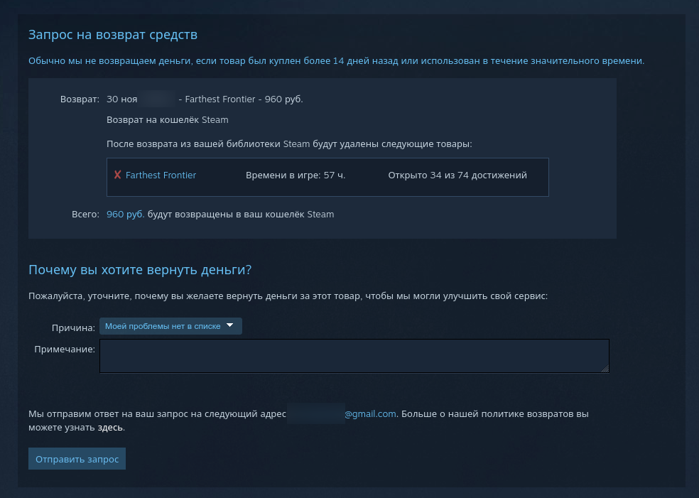 Как видишь, даже несмотря на то, что в игре я провёл больше 2-х часов и с момента покупки прошло больше 14 дней - я всё равно могу отправить заявку на возврат. Она будет рассмотрена, но, конечно, не факт, что одобрена.