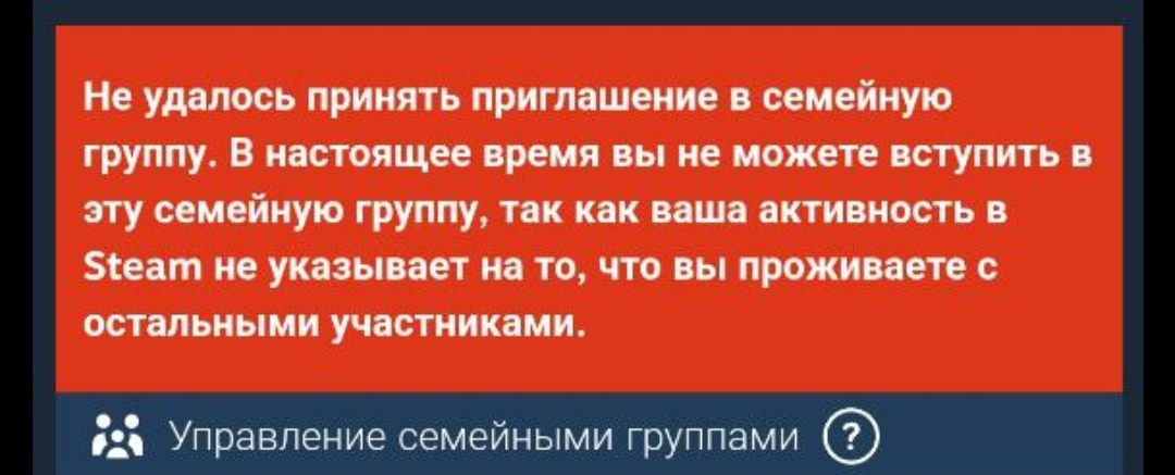 Не удалось принять приглашение в семейную группу. В настоящее время вы не можете вступить в эту семейную группу, так как Ваша активность в Steam не указывает на то, что Вы проживаете с остальными участниками.