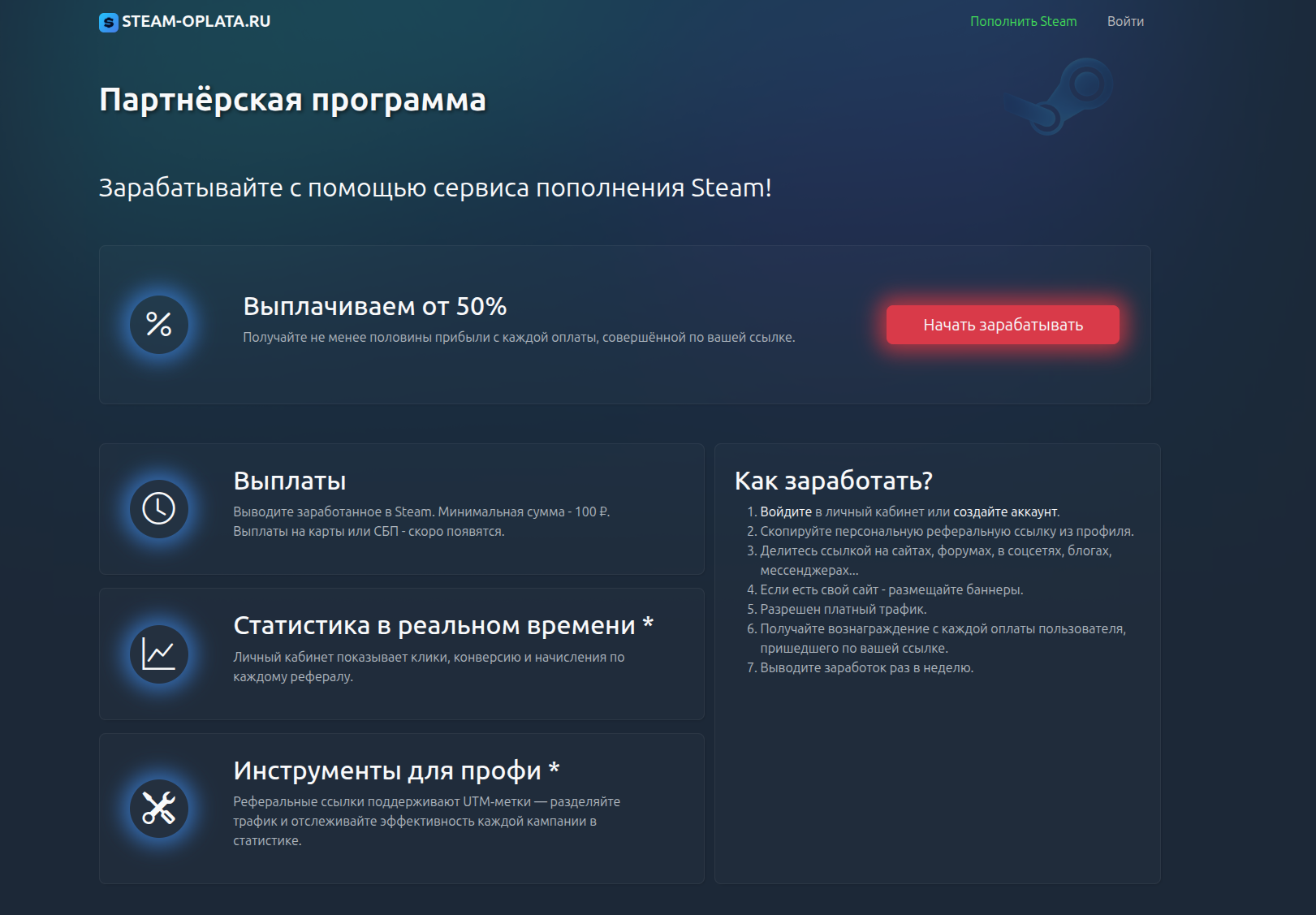 Подробнее о партнёрке можно почитать тут - https://steam-oplata.ru/partner.