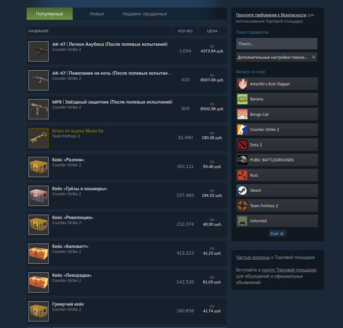Торговая площадка Steam — это официальный рынок, где пользователи покупают и продают внутриигровые предметы: скины, карточки, кейсы и другие вещи из поддерживаемых игр. Все операции проходят только внутри экосистемы Steam, и расчёт идёт через баланс кошелька — без вывода в реальные деньги. Вывести деньги можно только через сторонние сервисы - для этого предметы необходимо продавать через них, подробнее об этом чуть.